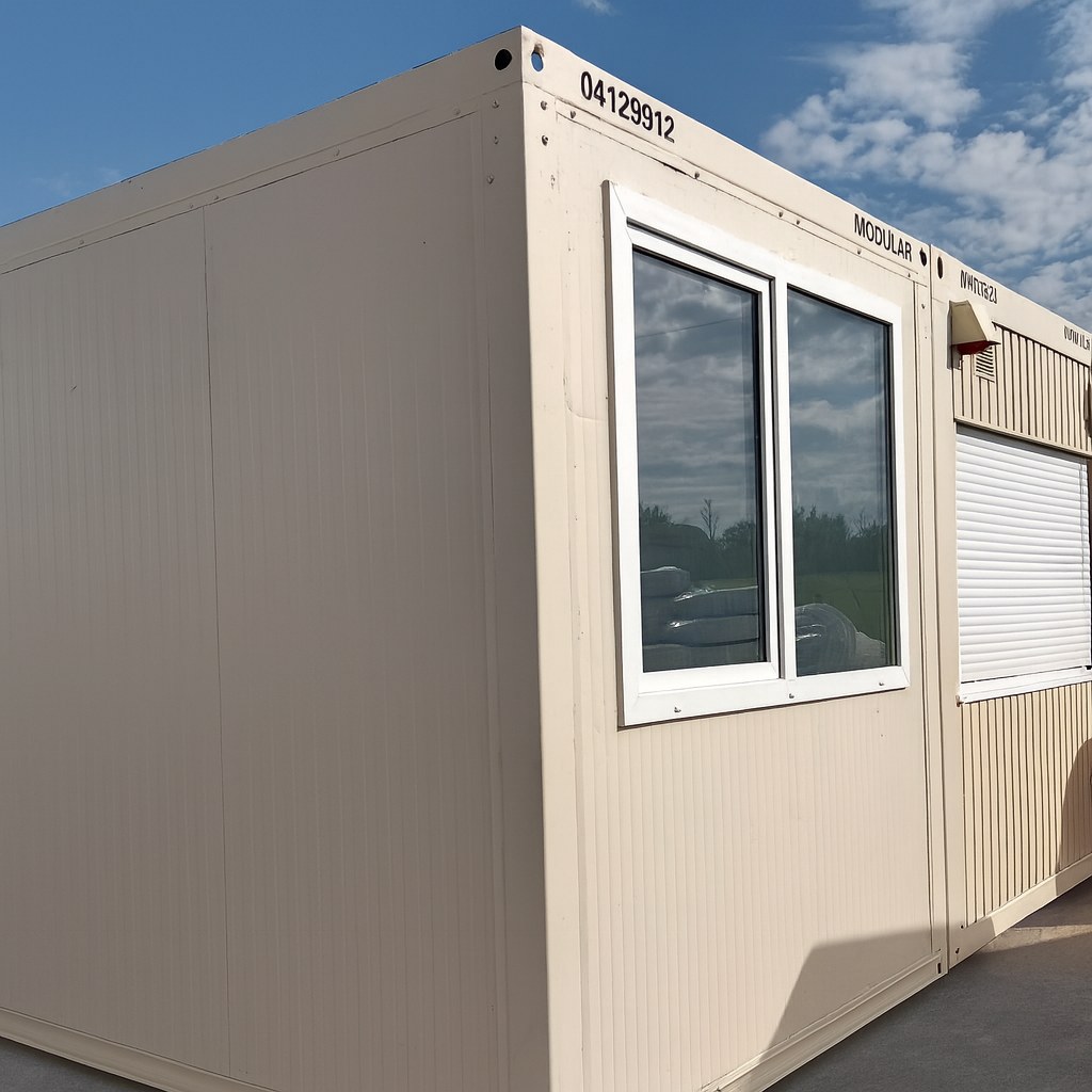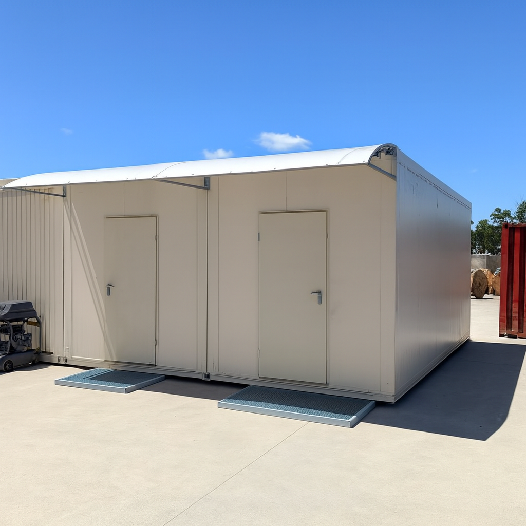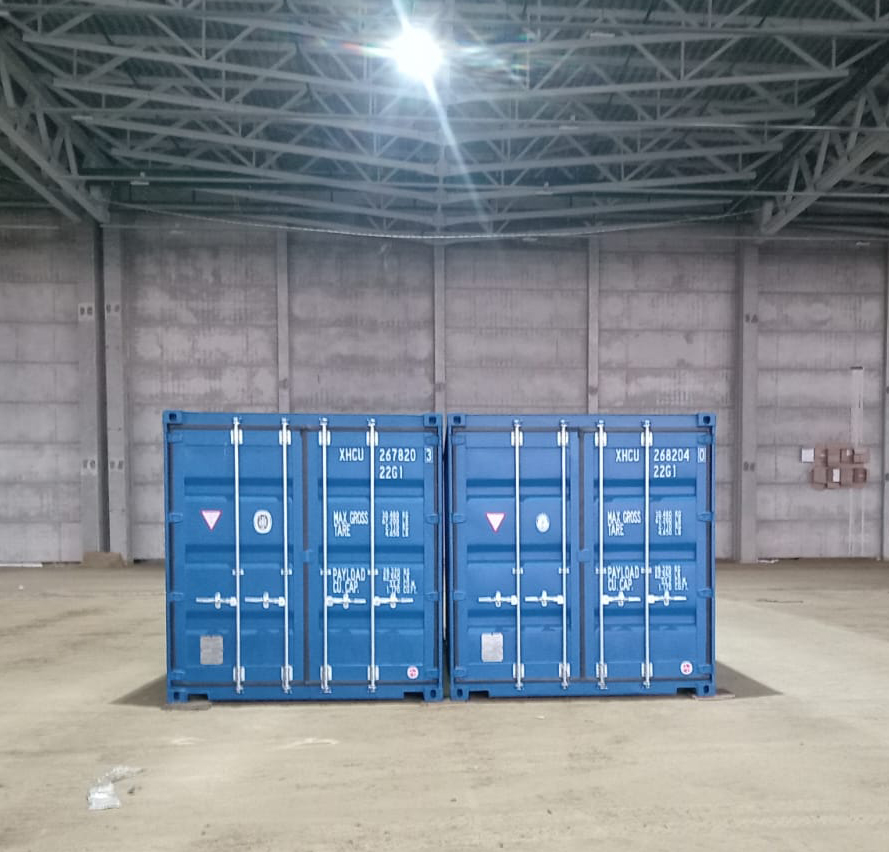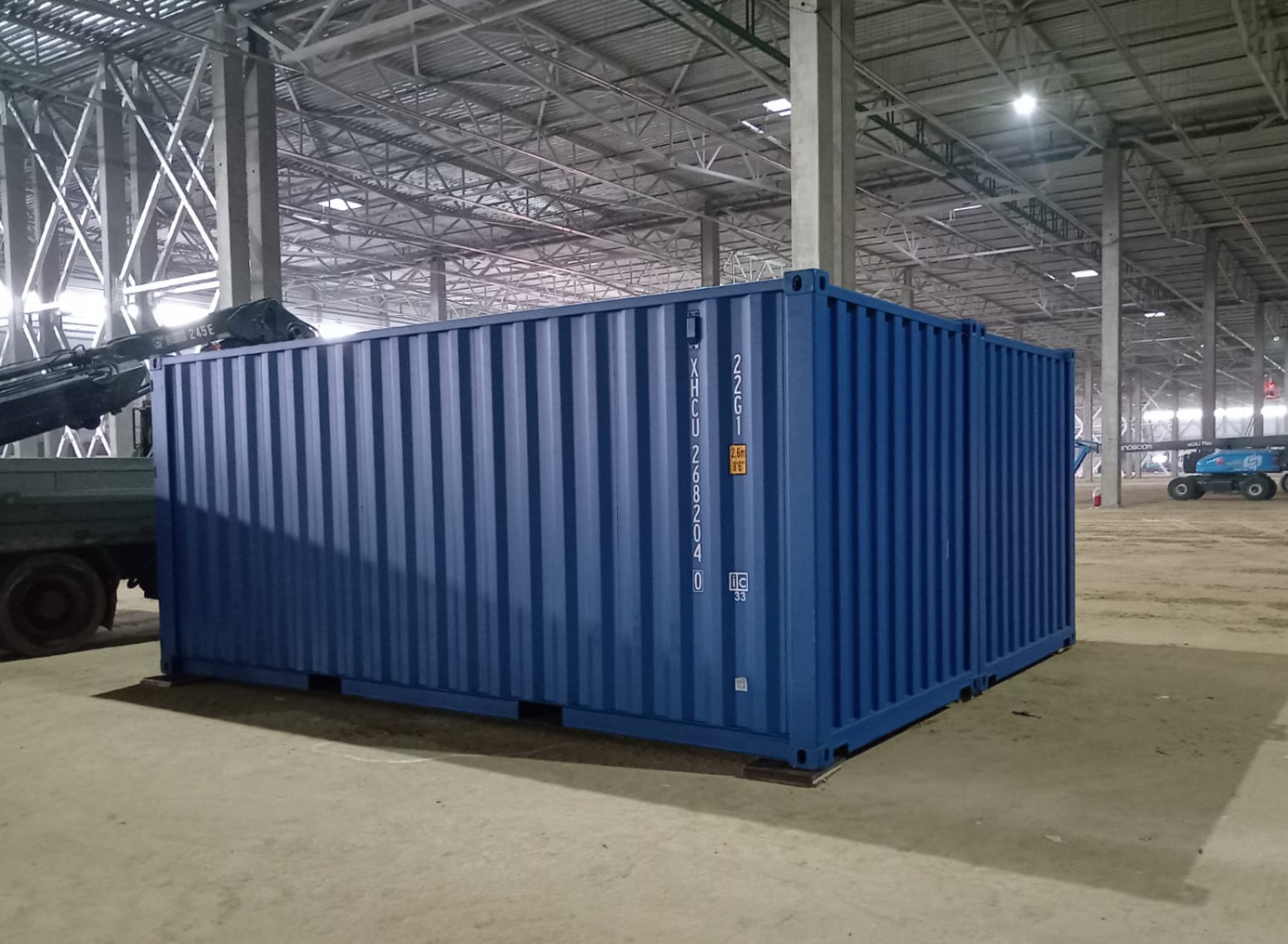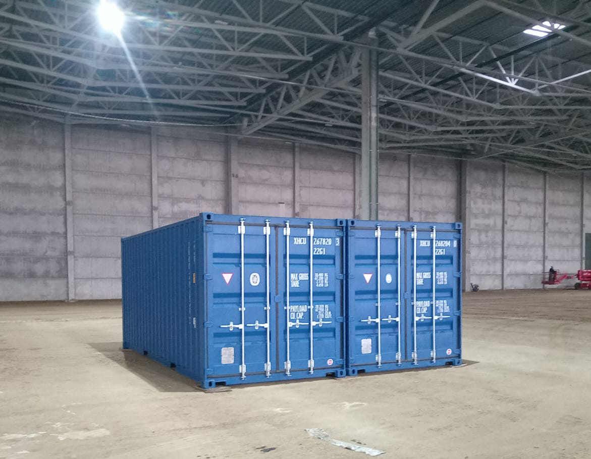 Обеспечение временного размещения строительного. Морские контейнеры используются в качестве складских помещений для хранения инвентаря и строительных материалов. Установка внутри ангара.