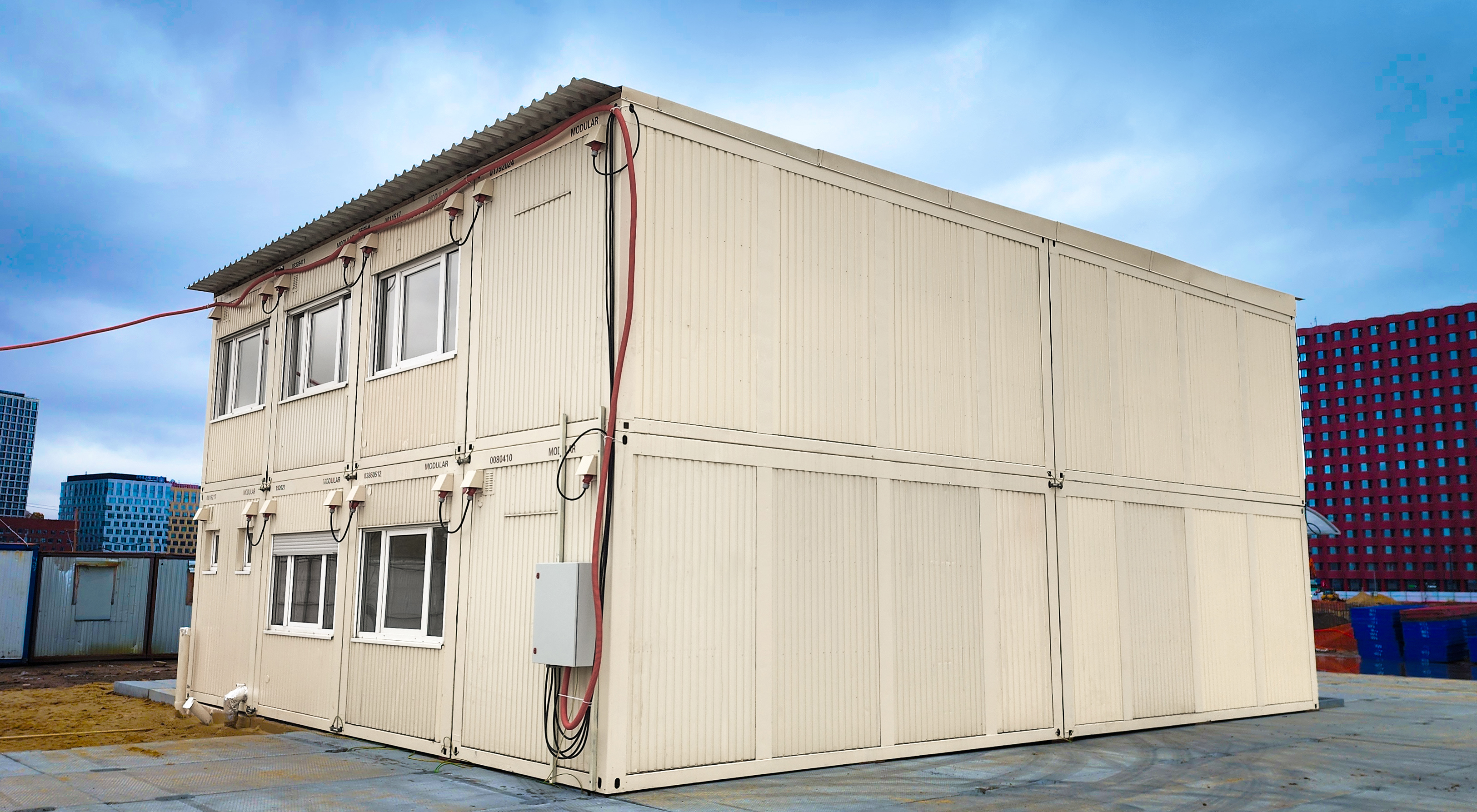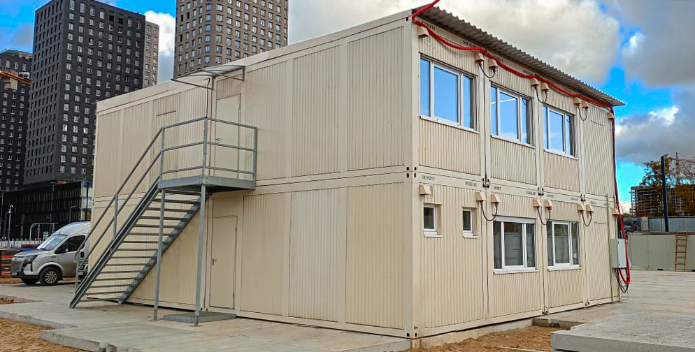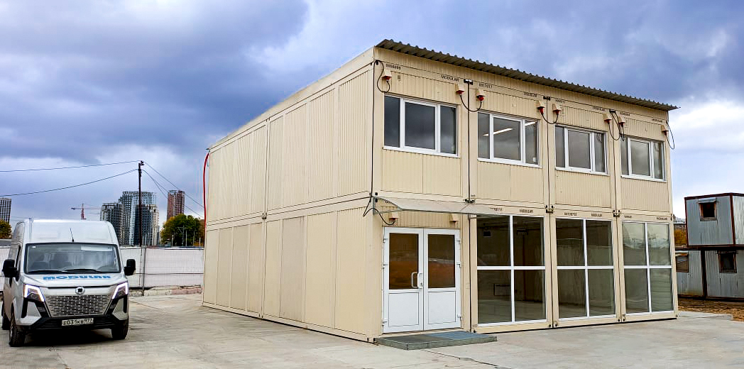 Офисное здание, выполняющее функцию штаба строительства, с интегрированными модулями автономной санитарии.
